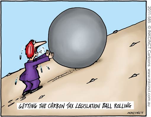 Australian PM Julia Gillard – ‘Getting the carbon tax ball rolling’ – cartoon by http://www.inkcinct.com.au